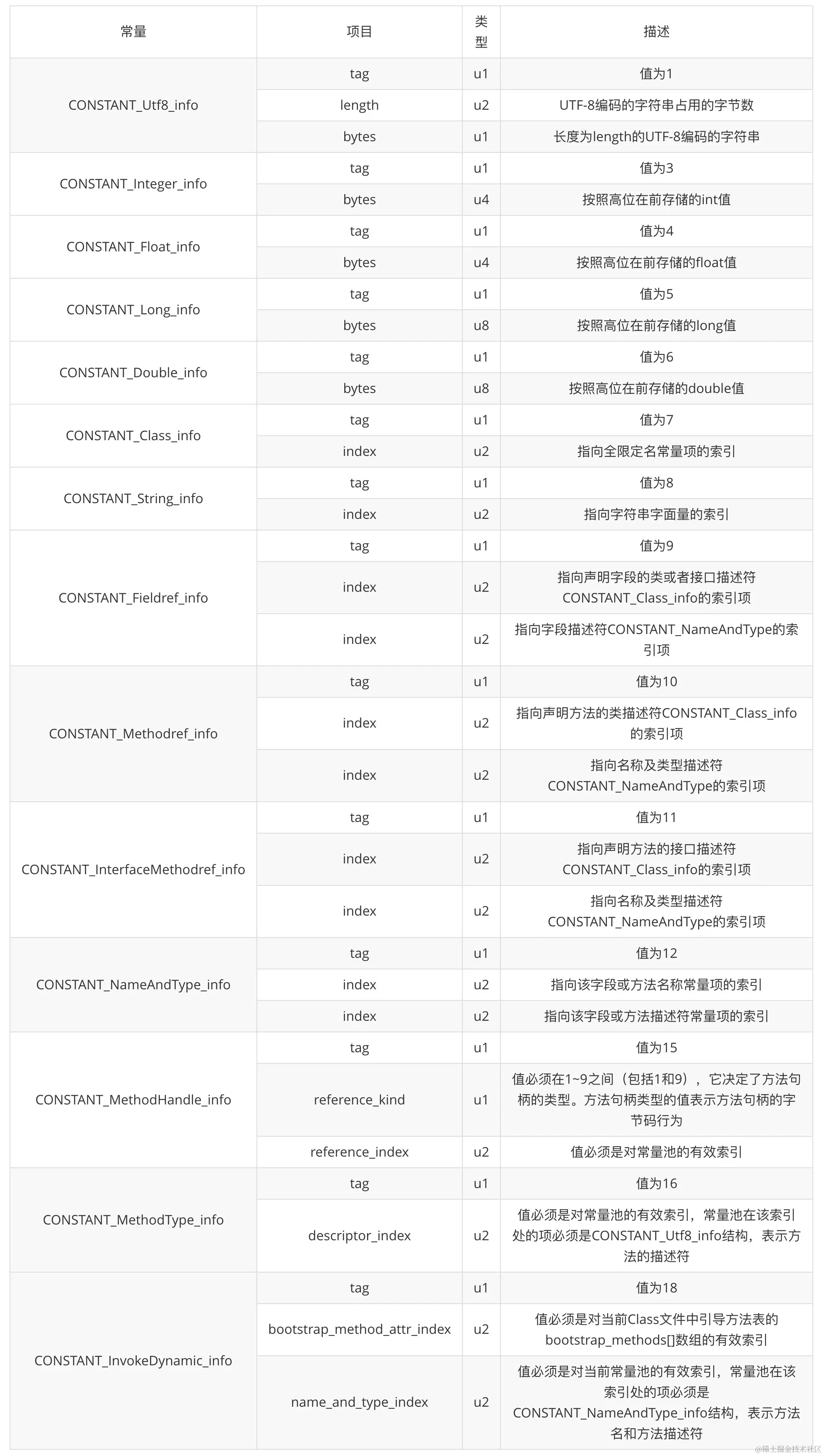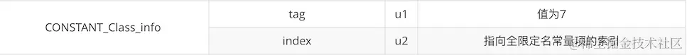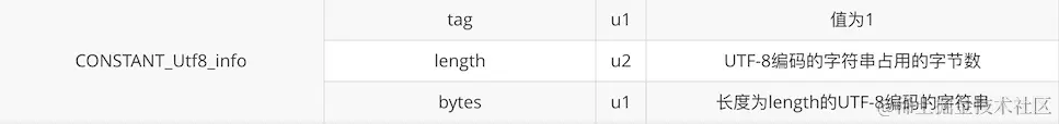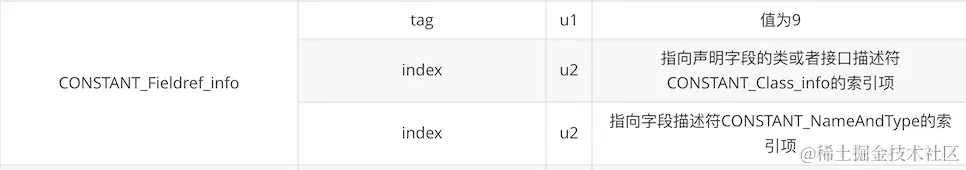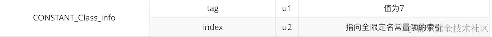 cp_info表结构一共有三个字段,第一个字段表示这个表结构的标示值,有一个字节大小,对应我们上一个表格中的数字。第二、三个字段表示其表结构的描述,不同字段其意思不太一样。