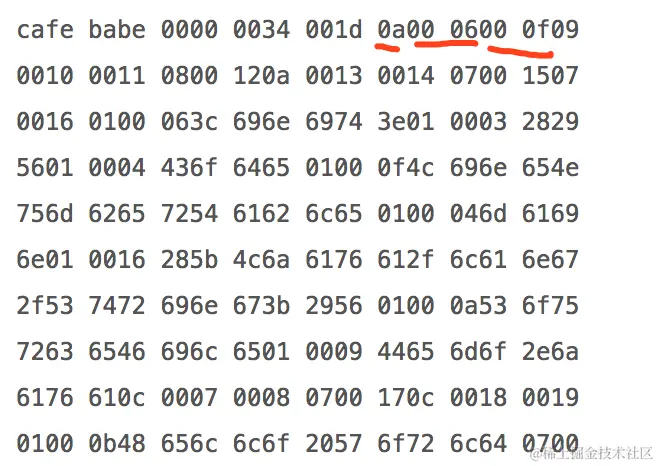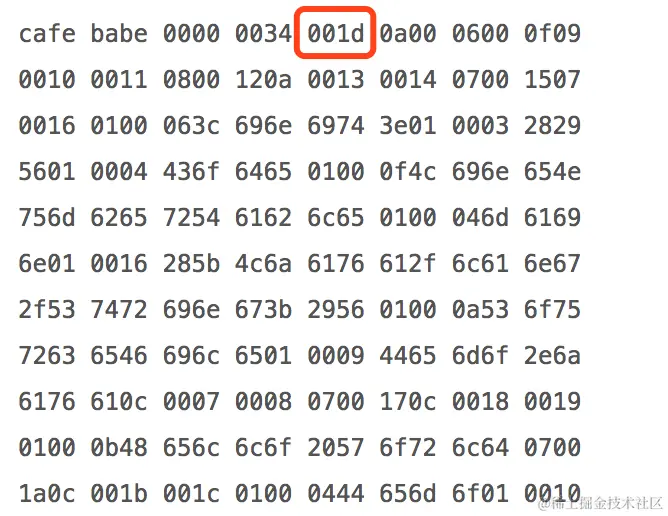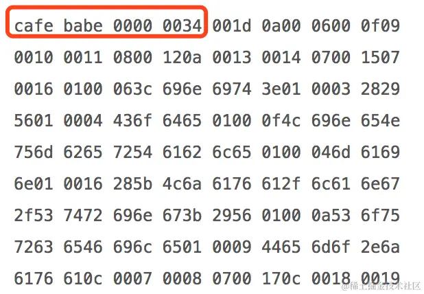 我们看看之前的 Demo 文件的 Class 文件内容,其前 8 个字节分别是:cafe babe 0000 0034。