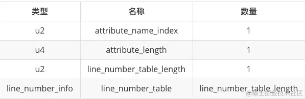首先,前两个字节表示属性名称索引,这里数据为:00 0A。指向了第 10 个常量,查阅可知值为:LineNumberTable。LineNumberTable 表的表结构如下图所示。