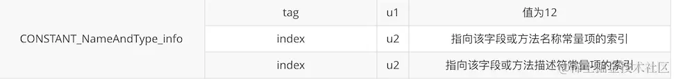 再查 cp_info 对应的表结构知道,该常量项第 2 - 3 个字节表示类信息,第 4 - 5 个字节表示名称及类描述符。