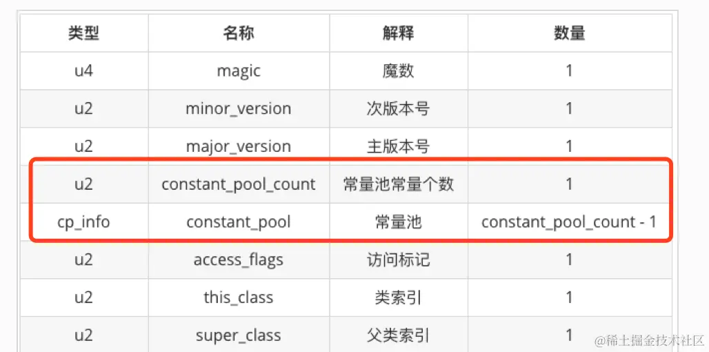 紧跟着常量池的就是 28 个常量了,因为每个常量都对应不同的类型,所以我们无法得知其具体大小,只能一个个分析。