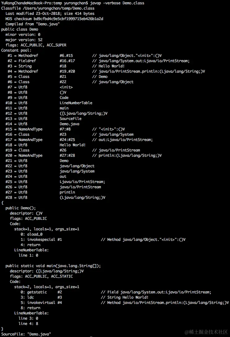 当我们运行javap -verbose Demo.class时,控制台会打印出该 Class 文件的构成信息,其中就包括了常量池的信息。