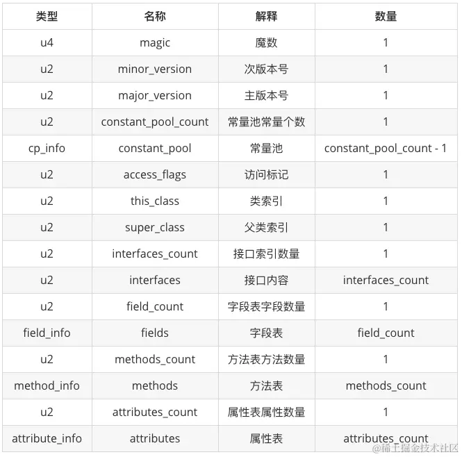 无符号数属于最基本的数据类型。 它以 u1、u2、u4、u8 六七分别代表 1 个字节、2 个字节、4 个字节、8 个字节的无符号数。无符号数可以用来描述数字、索引引用、数量值或者按照 UTF-8 编码构成的字符串值。例如下表中第一行中的 u4 表示 Class 文件前 4 个字节表示该文件的魔数,第二行的 u2 表示该 Class 文件第 5-6 个字节表示该 JDK 的次版本号。