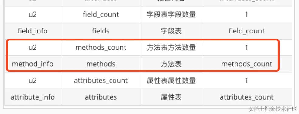 在字段表后的 2 个字节是一个方法计数器,表示类中总有有几个方法,在字段计数器后,才是具体的方法数据。这里数据为:00 02 。