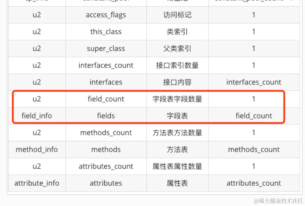 这里说的字段包括类级变量和实例级变量,但不包括在方法内部声明的局部变量。在类接口集合后的2个字节是一个字段计数器,表示总有有几个属性字段。在字段计数器后,才是具体的属性数据。