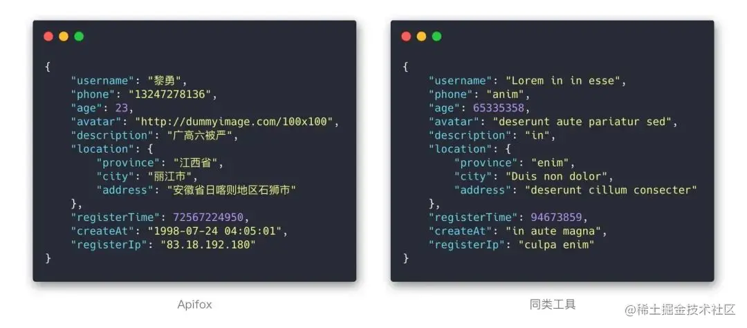 先放一张图对比下 Apifox 和其他同类工具 零配置 mock 出来的数据效果: