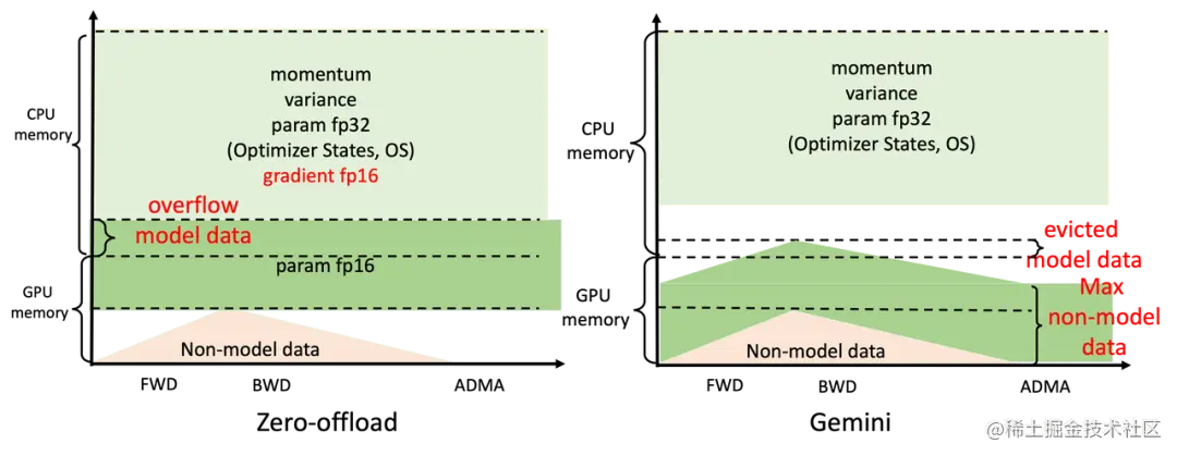 Colossal-AI 设计的 Gemini,就像双子星一样,高效管理和利用 GPU 与 CPU 的异构内存,让张量在训练过程中动态分布在 CPU-GPU 的存储空间内,从而让模型训练突破 GPU 的内存墙。