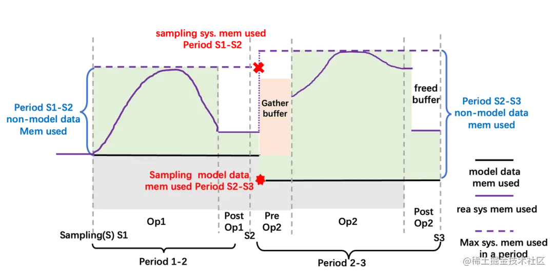 Colossal-AI 通过采样方式在 warmup 阶段获得 CPU 和 GPU 内存的使用情况。非模型数据的使用可以通过统计两个时刻之间系统最大内存使用 - 模型内存使用获得。模型的内存使用情况可以通过查询内存管理器得知,如下图黑色实线所示。