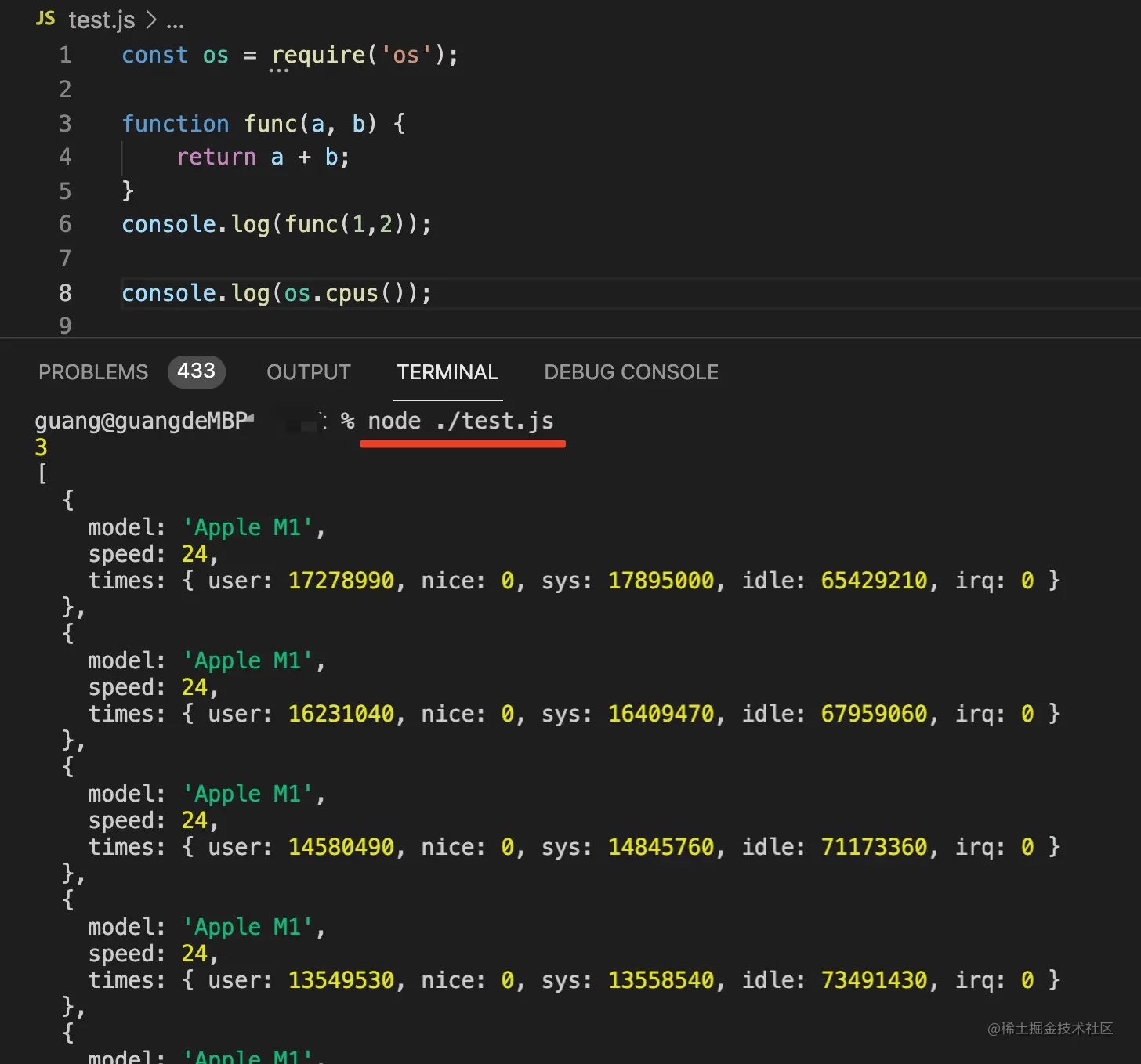 打印了 1 + 2 的结果,也就是 3 ,也打印了 CPU 核心的情况,8 核的 M1 芯片。