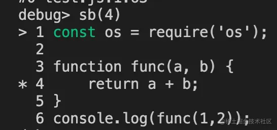 比如用 setBreakPoint(sb)命令在第四行打个断点: