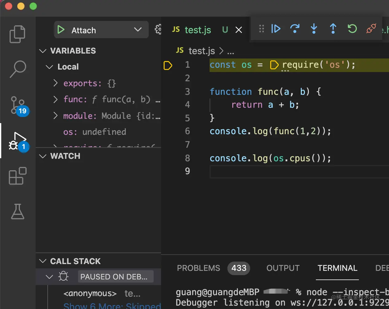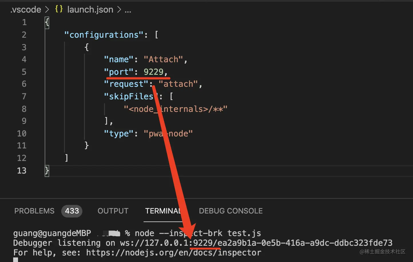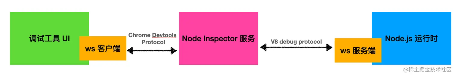 调试的原理就是 Node 启动 ws 的调试服务,调试客户端(chrome devtools、vscode 等)对接这个调试服务并实现交互的 UI,基于传输的调试协议来完成调试。