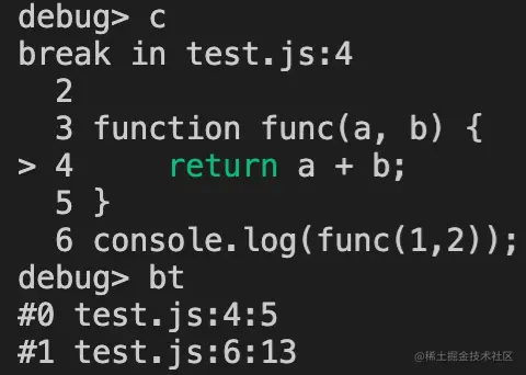 然后 cont(c) 命令继续执行,backtrace(bt) 打印调用栈: