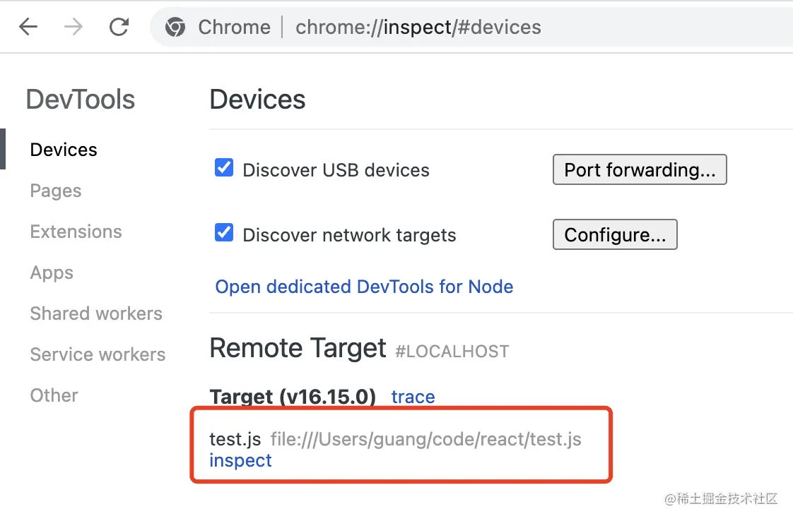 打开 chrome://inspect 的 url 就会看到这个可以连接的 target: