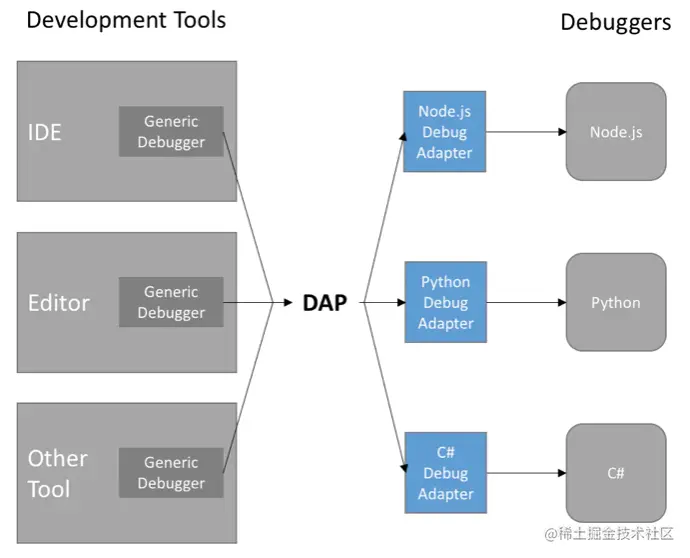 VSCode 为了同一个调试 UI 支持不同语言的调试,设计了中间的调试协议 Debug Apapter Protocol。Node.js 想在 VSCode 里调试的话只要实现对应的 adapter 即可。