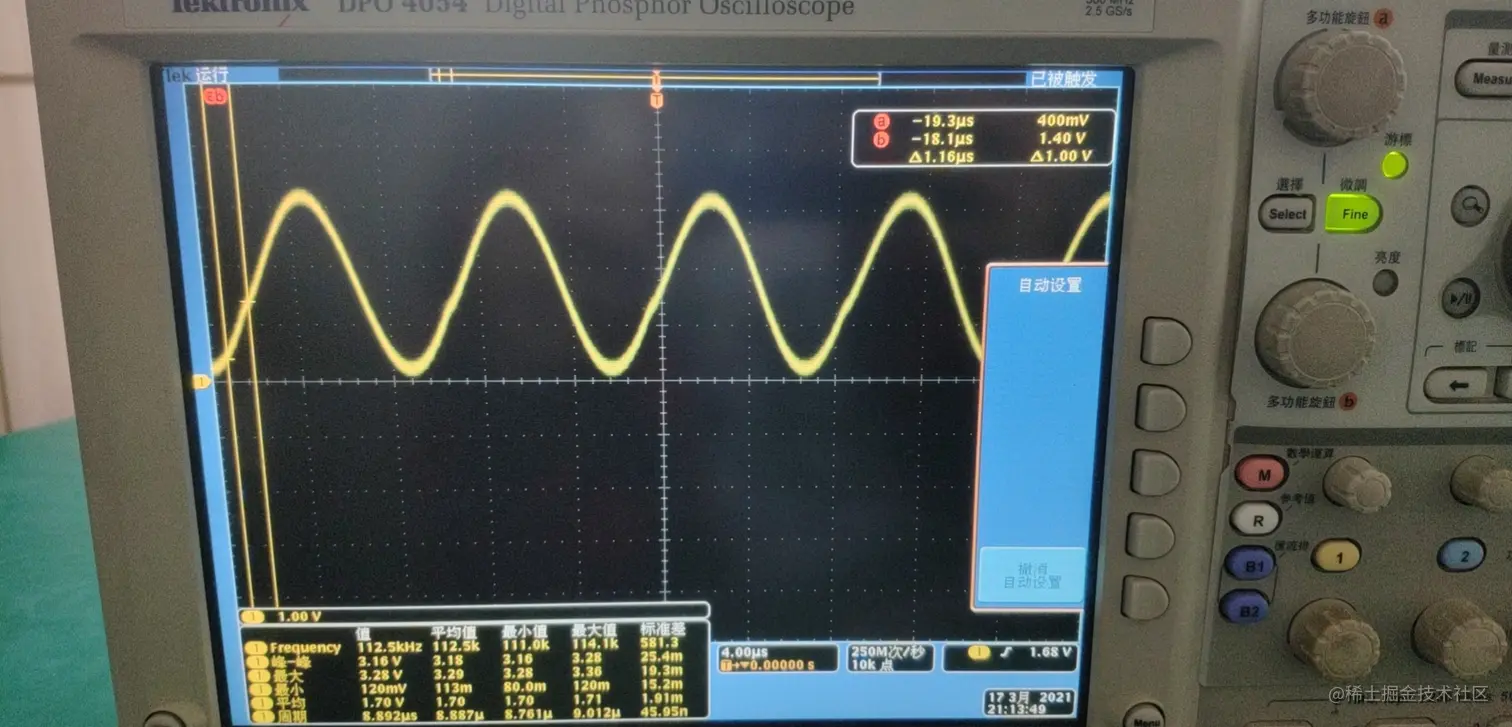 - 控制 DAC 输出时,每隔一段相同的时间从上述正弦波表中取出一个新数据进行输出,即可输出正弦波。改变间隔时间的单位长度,可以改变正弦波曲线的周期。