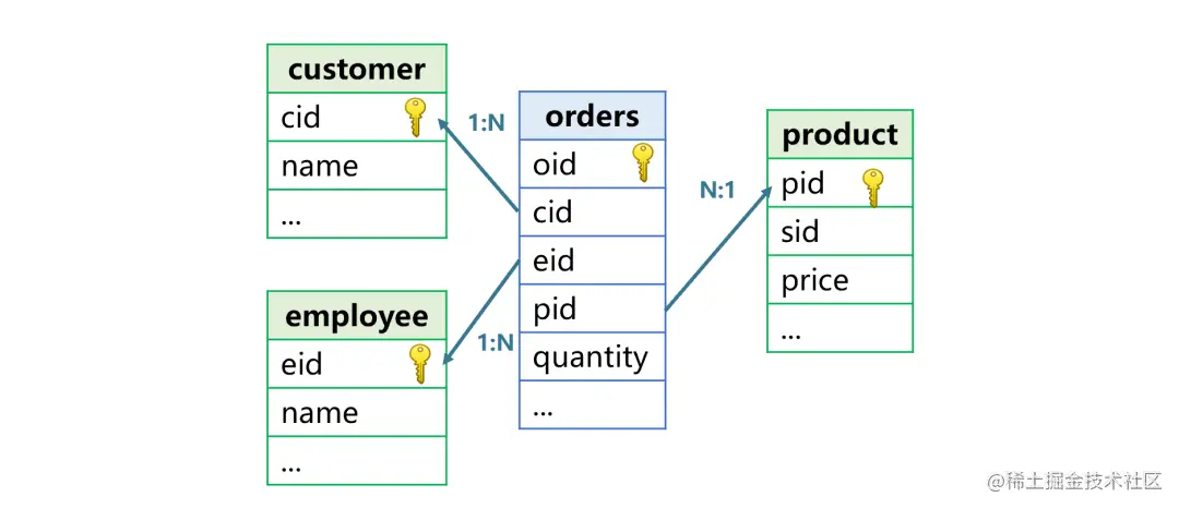 外键关联是指用一个表的非主键字段,去关联另一个表的主键,前者称为事实表,后者为维表。比如下图中,订单表是事实表,客户表、产品表、雇员表是维表。