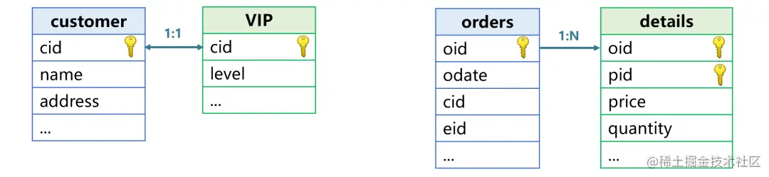 主键关联是指用一个表的主键关联另一个表的主键或部分主键。比如下图中客户和 VIP 客户、订单表和订单明细表的关联。
