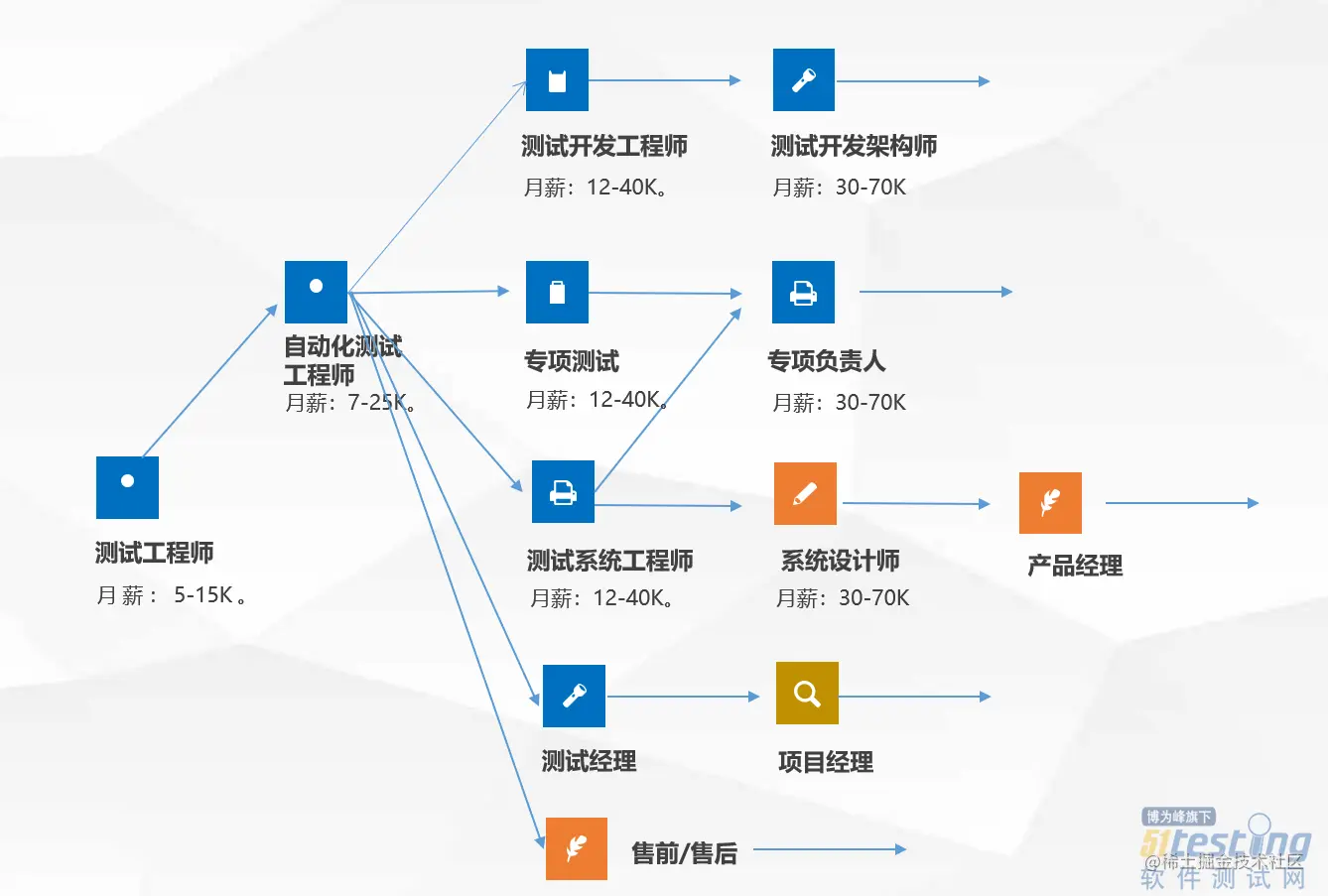 软件测试人员的职业发展路径,在IT行业里面是很宽的,进可做项目管理、构架师、售前,退可做技术支持和运维。