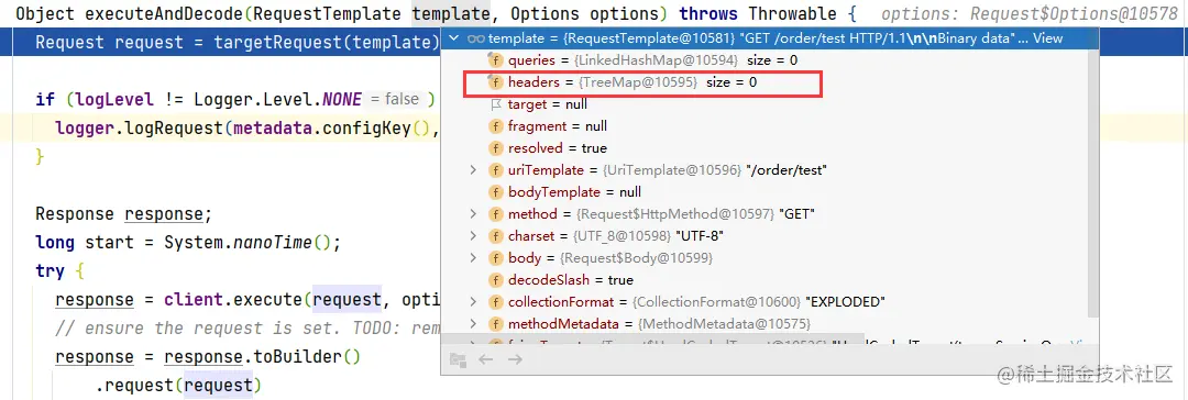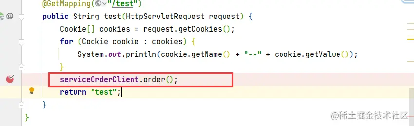 刚才我们进行了测试,发现在订单模块中直接访问Session可以获取User对象,然而通过远程调用,User就获取不到了,我们可以猜测这是OpenFeign出现了问题,Debug调试一下项目,这是远程调用的代码: