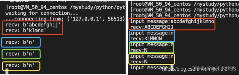 首先把双方的bufsize都改成10,然后将服务端代码中的 “rsp = prefix + data.upper()” 语句 改成 “rsp = data.upper()”,主要目的是为了更直观的看清收发机制。