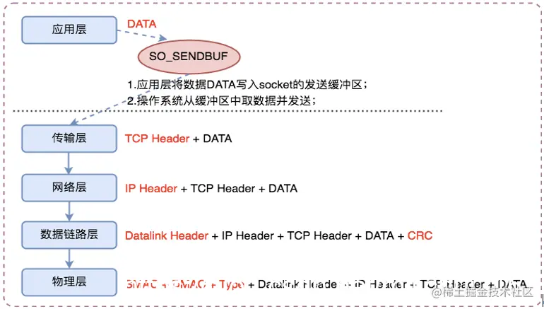 (1)应用层:对应用层来说它只关心发送的数据DATA,应用调用send函数将数据拷贝至socket在内核中的发送缓冲区SO_SENFBUF即返回(注意数据不一定发送发送出去,send仅仅是拷贝数据至发送缓冲区),操作系统会将SO_SENDBUF中的数据取出来进行发送。