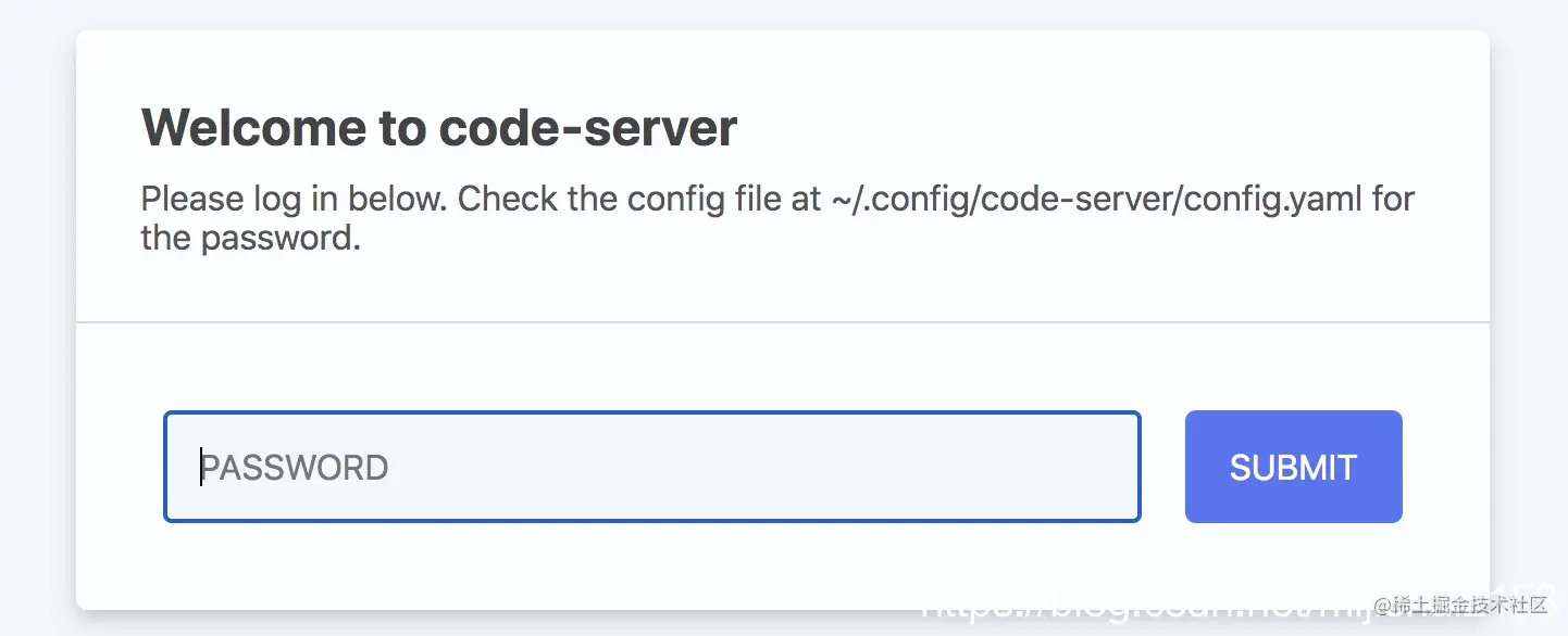 之后就可以在本地浏览器输入 9.134.XX.94:8888/ 访问了。首次访问的时候,需要输入登陆密码,这个登陆密码就在"~/.config/code-server/config.yaml"文件中,粘贴上去即可。