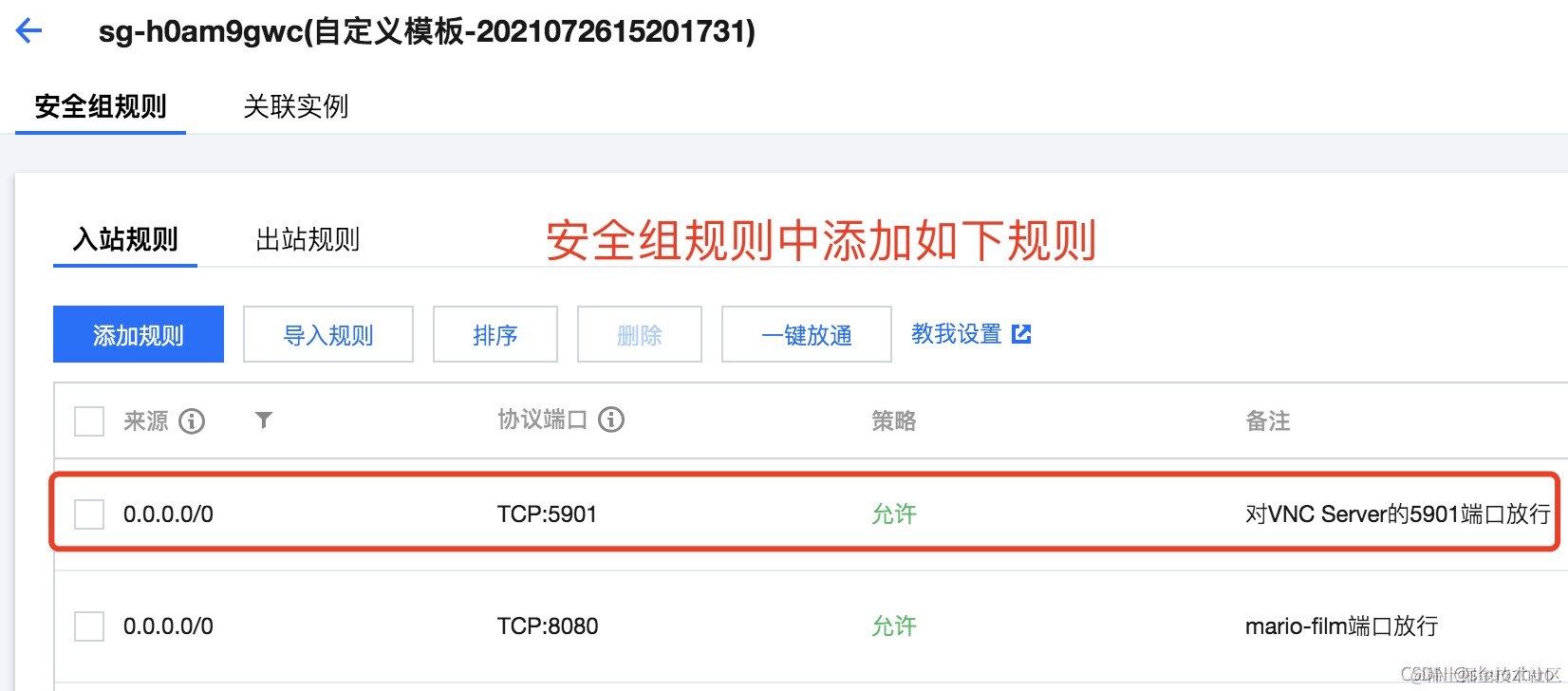 ②对于云服务器(或者公网ip)还有一个添加安全组规则的步骤不要忘了,具体来说就是放行TCP的5901端口。注:当然你可以完全暴露,但是不推荐。 关于,腾讯云服务器放行端口、配置安全组网上搜一下就知道咋整了。