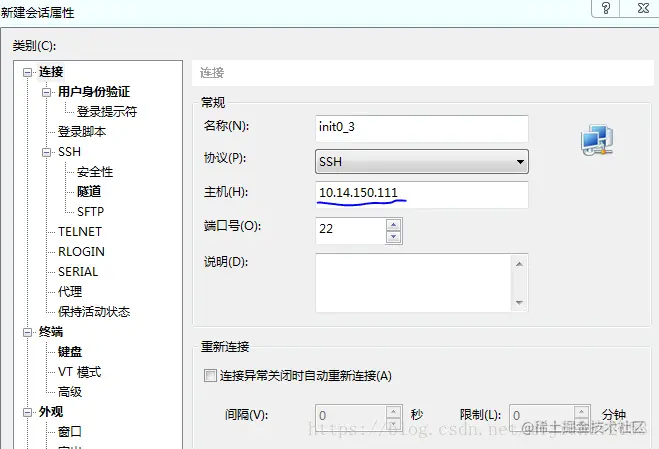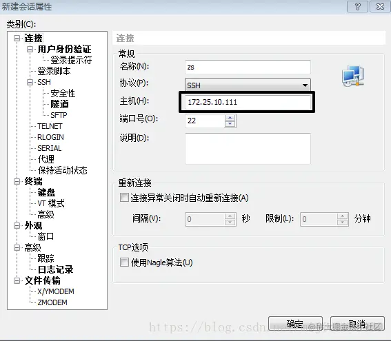 (2)主机栏里填入linux虚拟机的ip地址(就是第三步的ADDR),其他那要求填写。点击确定