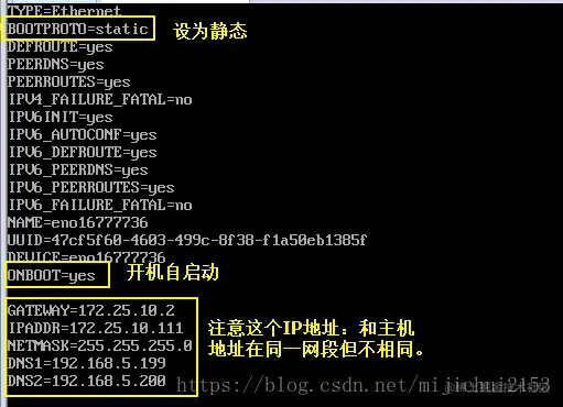 注:以上步骤分别是1)设置静态IP 2)开机自启动 3)IP地址和主机IP地址在同一网段但不相同(倒数第二段位不同即可)