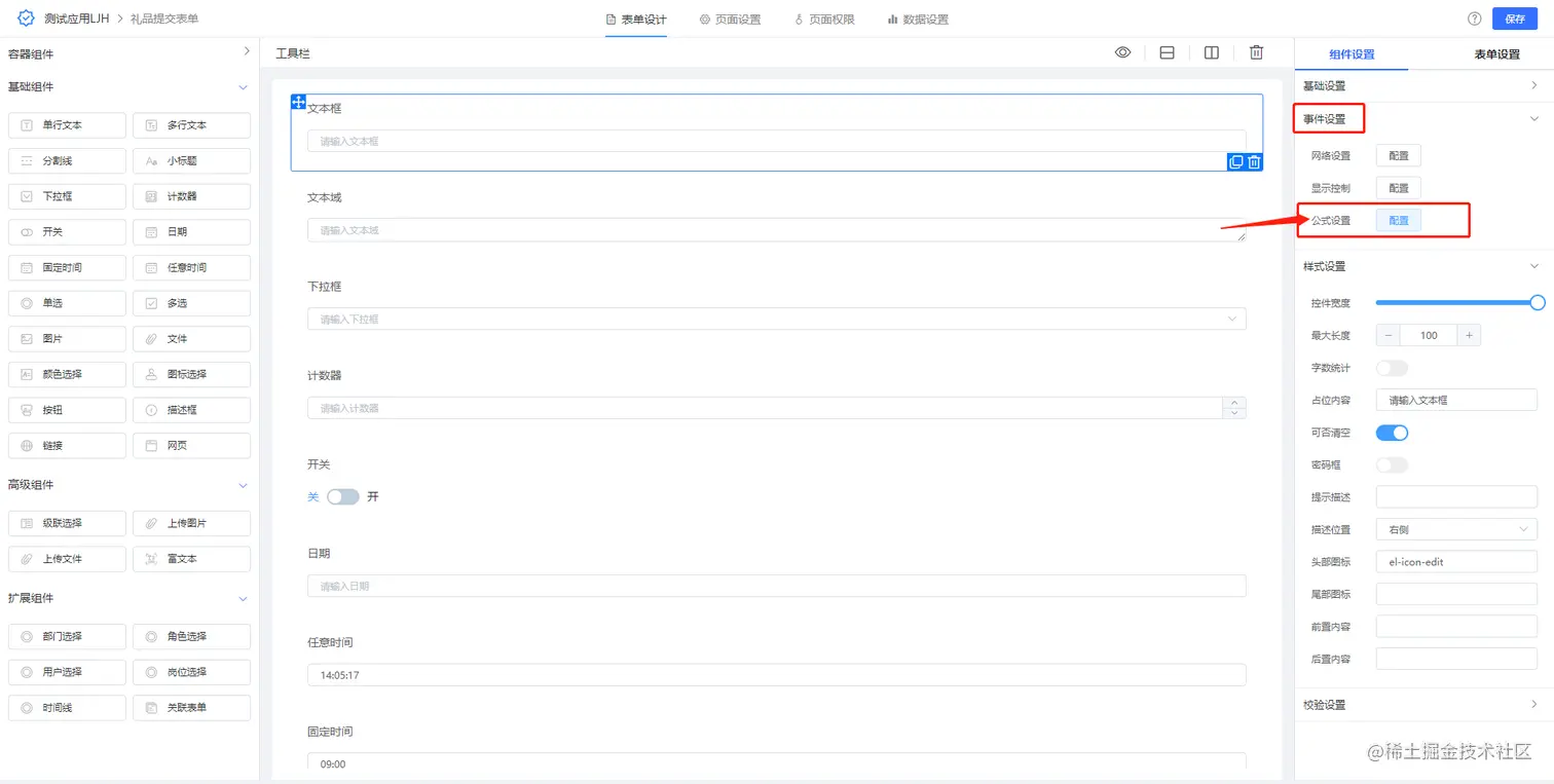 **路径:**选择画布中的组件 >> 属性配置面板 >>事件 >> 公式设置 >>配置