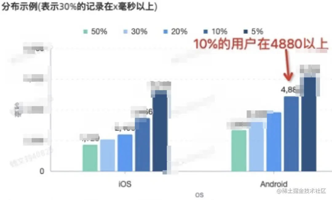和开发说明问题严重性时,这个会很有代入感,比如见下图,10%的Android用户在4.9s以上,是不是可以认为他们大部分都跳失了?