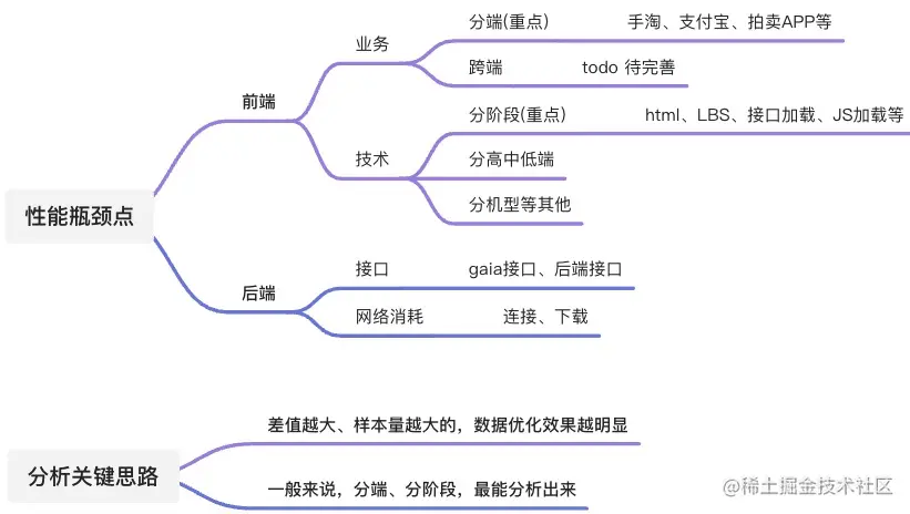 首先要明确,性能分析主要是给相关页面的前端、开发同学看,给关心问题的测试同学看,所以我们可以拆分的更细节、更专业。可以先分前端、后端2个大类: