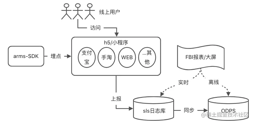 arms-sdk结合前端的自定义埋点,在海量用户访问的同时,就会自动上报数据到sls日志库,整体过程如下图:
