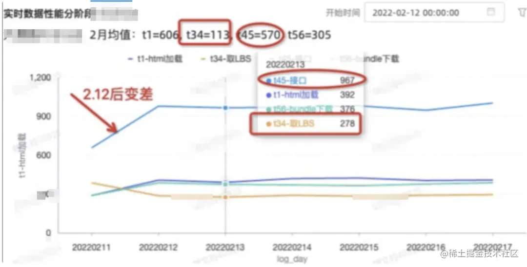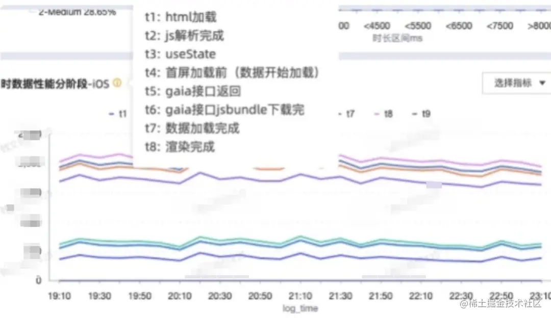 下图将t1~t9 每个阶段打点情况可视化,并分析重点环节的差值(打点逻辑由前端定义)