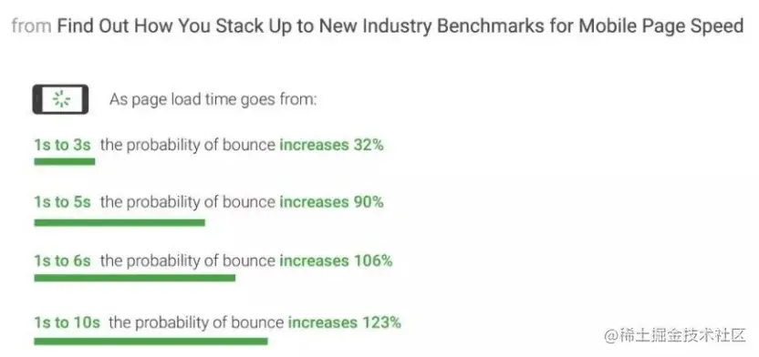 加载时间从 1s 延长到 5s 时,跳失率增加90%——用户还没看到辛苦优化的页面,就走了一部分 。