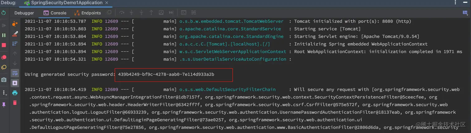 @Configuration public class SecurityConfig extends WebSecurityConfigurerAdapter { @Bean PasswordEncoder passwordEncoder() { //不加密 return NoOpPasswordEncoder.getInstance(); } @Override protected void configure(AuthenticationManagerBuilder auth) throws Exception { //两个用户,中间使用and相连 auth.inMemoryAuthentication().withUser("jaminye").password("123456").roles("admin") .and().withUser("user").password("12354").roles("user"); } //作用同上 /*@Override @Bean protected UserDetailsService userDetailsService() { // 内存 InMemoryUserDetailsManager manager = new InMemoryUserDetailsManager(); manager.createUser(User.withUsername("jaminye").password("123456").roles("admin").build()); manager.createUser(User.withUsername("user").password("12354").roles("user").build()); return manager; }*/ } - 日志中看到UserDetailsServiceAutoConfiguration类,getOrDeducePassword方法中看到这个打印语句