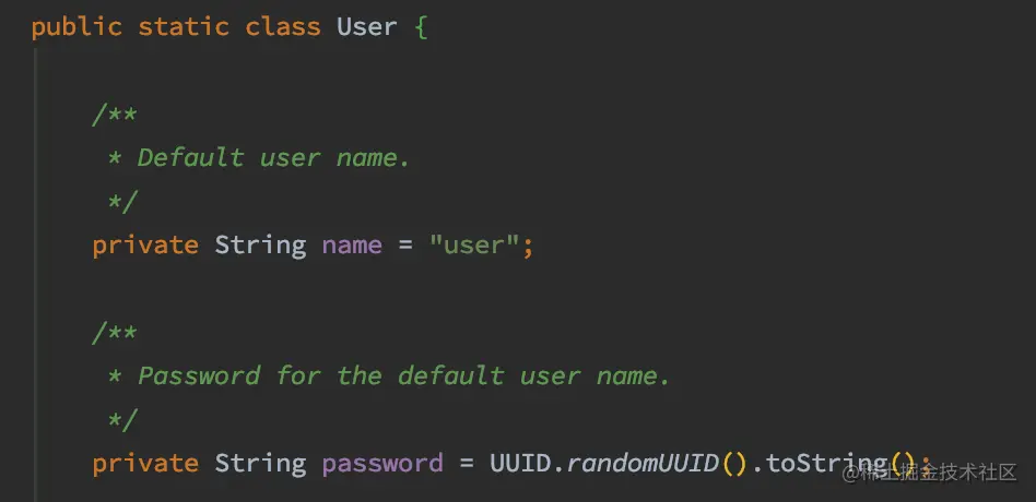 - 其中有个SecurityProperties.user实体类,进去就能看到我们的账号密码是如何来的