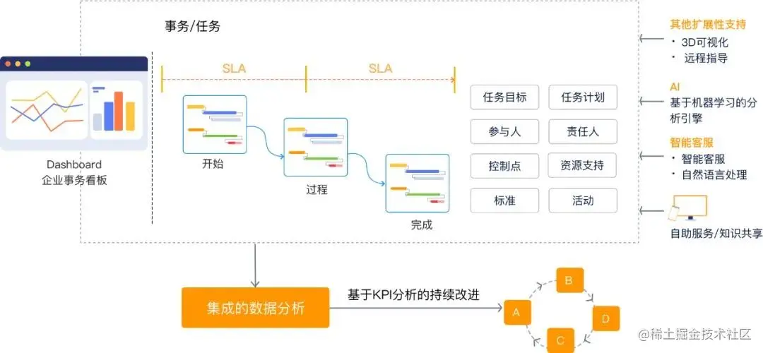 在企业管理任务、事务执行过程中,搭建基于KPI的SLA的服务量化体系和过程标准,不仅可以精确管控服务过程,还能够量化服务过程、服务结果及服务评价,以此达到量化任务的目标。