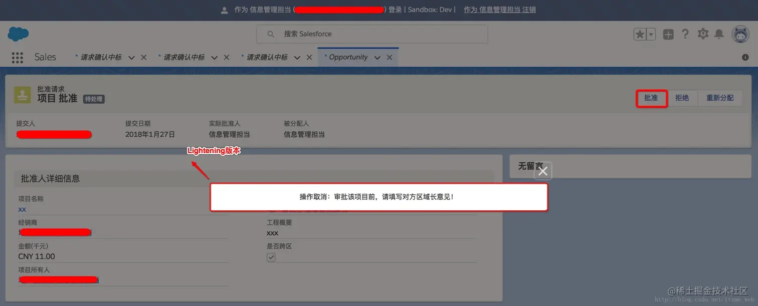 #2. 如果终审人批准,必须校验画面上某字段必填才能执行批准操作;例如:跨区审批商机,必须由信息管理担当录入对方区域长意见这一字段才能批。