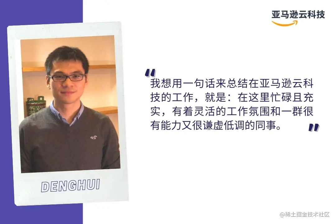 Denghui:技术方面亚马逊云科技是业内标杆,工作中很多用到的技术和方案都已经是行业内的事实标准。同时,我一直是长期主义思考的拥护者,所以也想深入近距离学习亚马逊企业文化的执行细节;这也是吸引我加入亚马逊云科技的原因。
