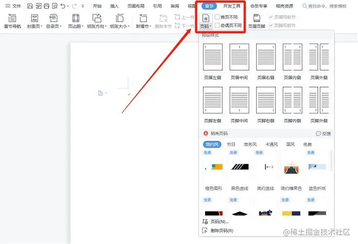 步骤一: 在word文档的最上方工具栏找到【章节】,在章节里点击【页码】,即可选择自己喜欢的页码呈现形式,例如页眉页脚都分别有不同的位置可以设置。