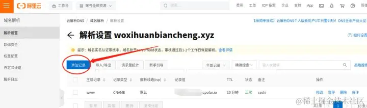 在“域名解析”页面,我们找到需要添加安全证书的网站域名,点击域名上方的“添加记录”按钮。