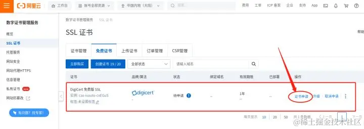 此处点击“创建证书”按钮后,会自动转入证书创建页面,再点击右侧的“证书申请”,就能进入我们域名与证书绑定的设置页面。
