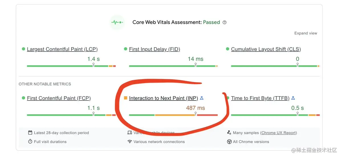 这些只是初步的优化结果,后续还有很多优化工作值得去做。比如INP(Interaction to Next Paint,与下一次Paint的交互)指标还是偏高: