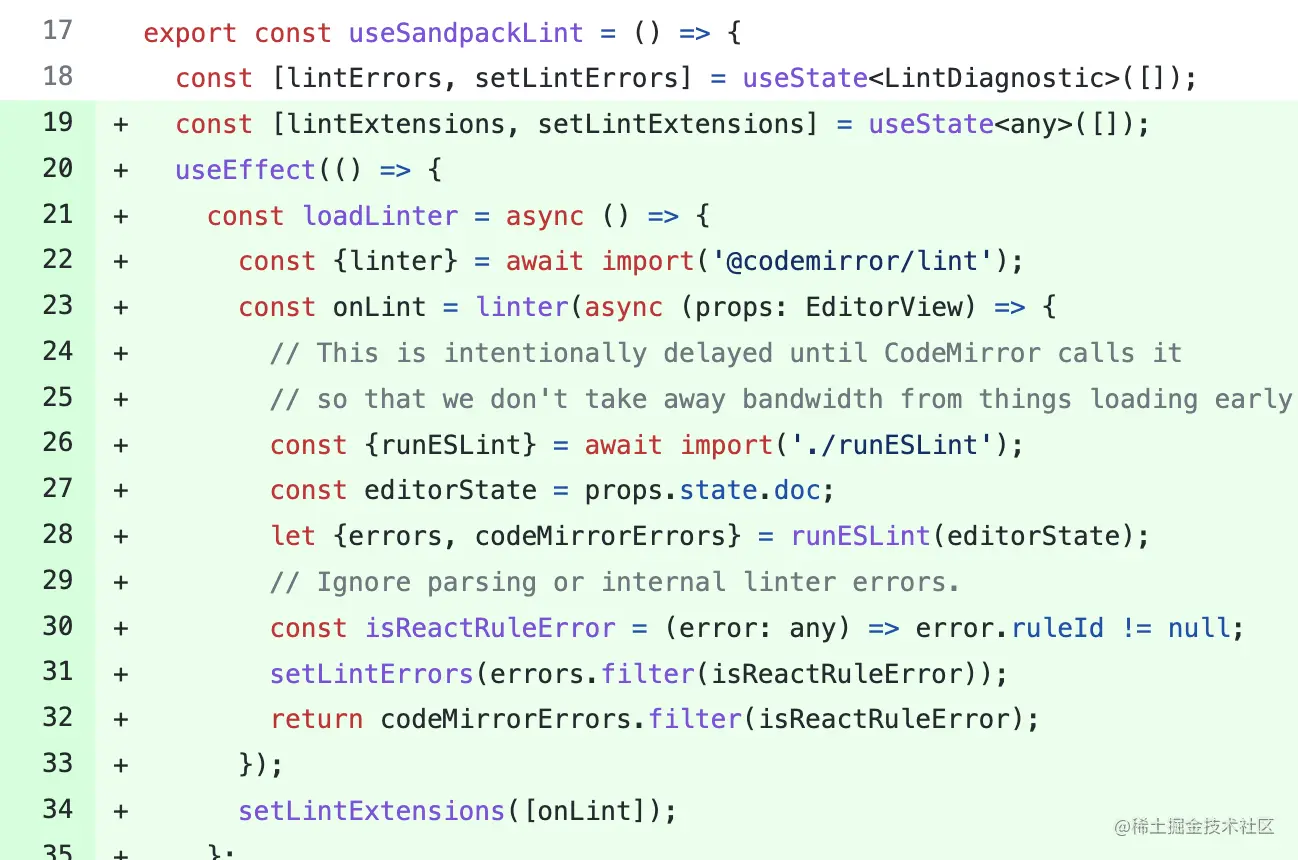 新文档中存在很多codesandbox(在线示例),这些示例依赖CodeMirror linter,但这不是首屏必需的。
