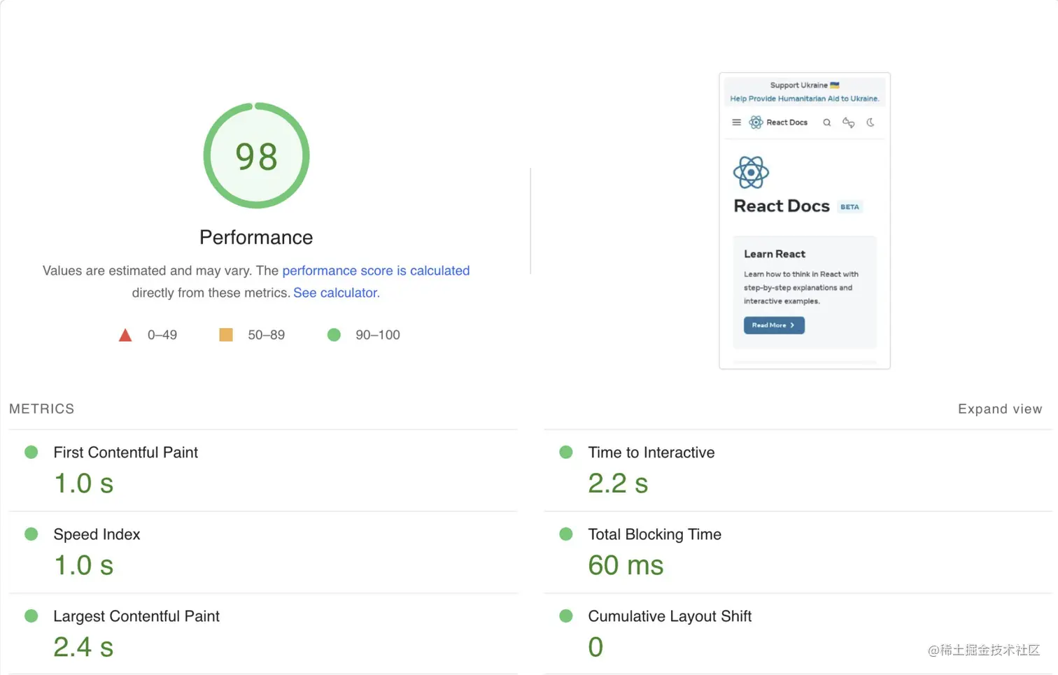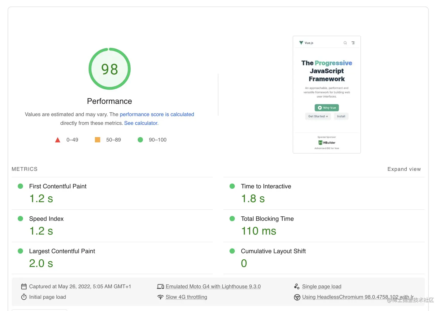 作为对照,Vue文档的跑分: