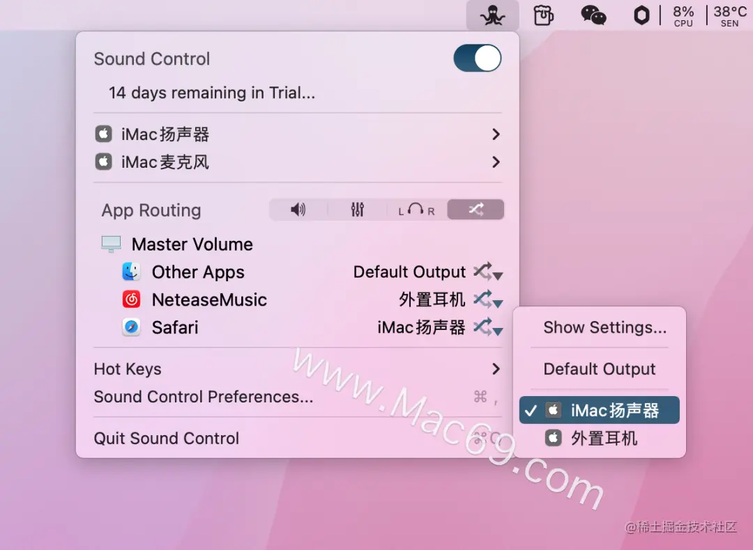 Sound Control 还支持将不同软件的音频传输到不同的指定音频输出设备。比如可以让浏览器视频用 Mac 内置扬声器播放,音乐软件用外接的音箱播放。实现音频路由。