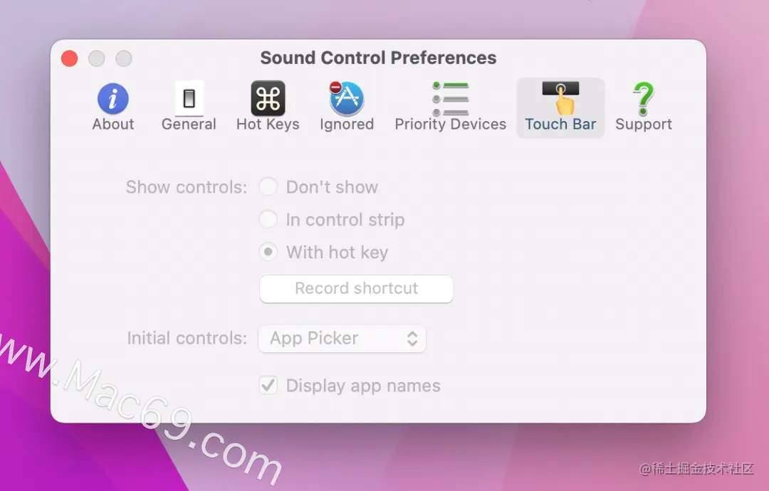 另外在软件的偏好设置里还可以设置全局热键控制、忽略软件和设备的白名单,以及支持 Touch Bar 操作。