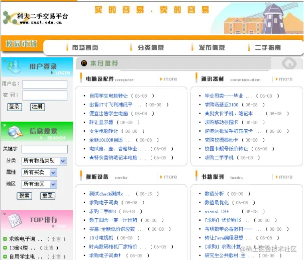 系统主页是面向平台的所有访问者,注册用户和非注册用户都可以进入到系统主页面,查看相关的二手信息及二手指南。主页面由平台Logo、登录框、搜索框和各种类型的最新二手信息列表组成。主页面效果如图