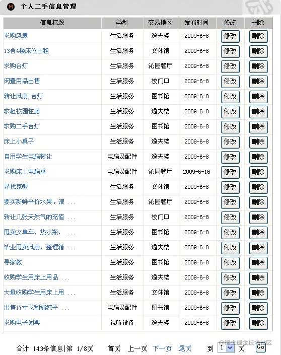 信息管理分为普通用户个人信息管理和管理员会员信息管理。管理页面显示了要管理信息的重要信息,并提供链接可进入详细信息页面。每个信息都有修改、删除按钮。这里只介绍个人信息管理页面,页面效果如图